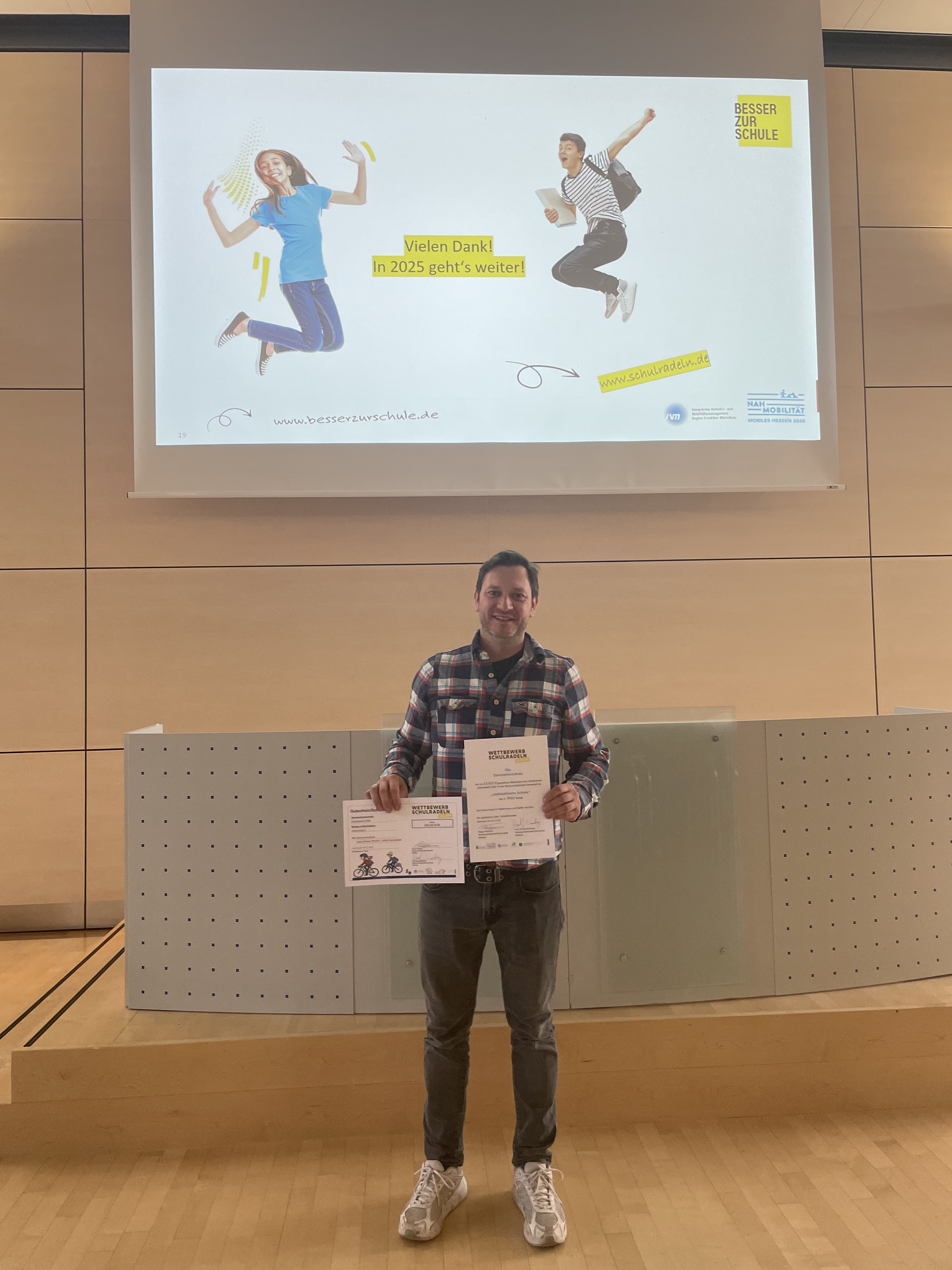 Die Ehrung der Sieger des Landkreises und der Stadt fand am 6. Dezember 2024 im Kreissitzungssaal in Kranichstein statt. Die Eleonorenschule durfte sich über ein Preisgeld von 250 Euro freuen, welches voraussichtlich in weitere Projekte rund ums Thema Radfahren investiert wird.