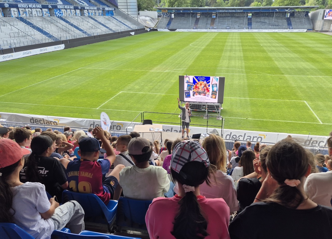Zusammen mit den anderen Kindern lauschten sie der Gruselgeschichte aus dem neuen Buch „Mumienwächter“, die Stefan Gemmel im Stadion am Böllenfalltor zum Besten gab. Gleichzeitig feierten sie die Freiheit des Wortes und das 100-jährige Bestehen des PEN-Zentrums Deutschland in Darmstadt, das die Veranstaltung zusammen mit dem Leserattenservice organisierte.