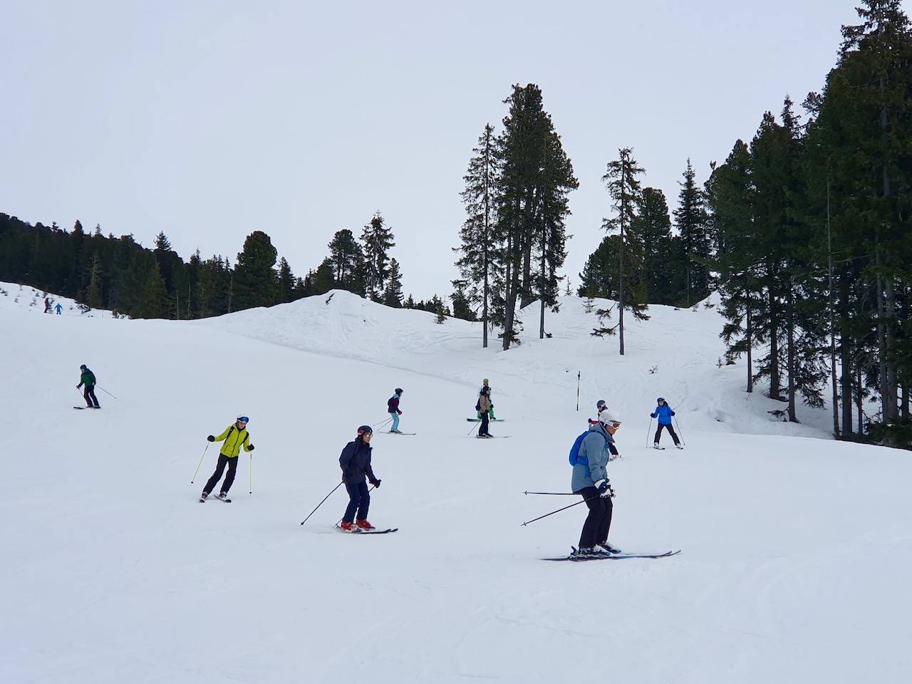 Jeden Morgen nach dem Frühstück fuhren alle gemeinsam mit dem Skibus zur Mittelstation, um mit der Gondel ins Skigebiet zu gelangen. Dort angekommen fand dann ein gemeinsames Aufwärmen statt, bevor die verschiedenen Skigruppen ins Skigebiet aufgebrochen sind.
